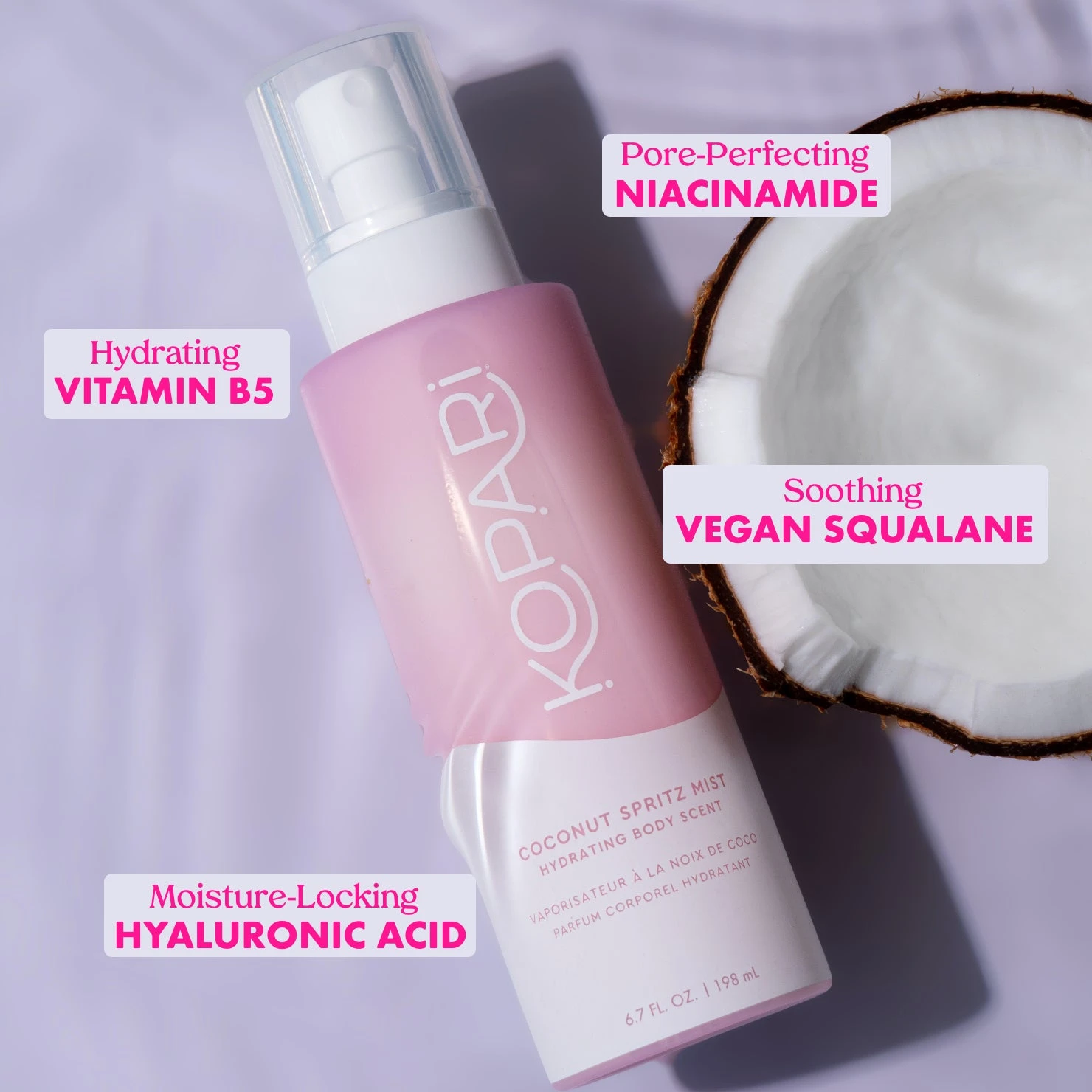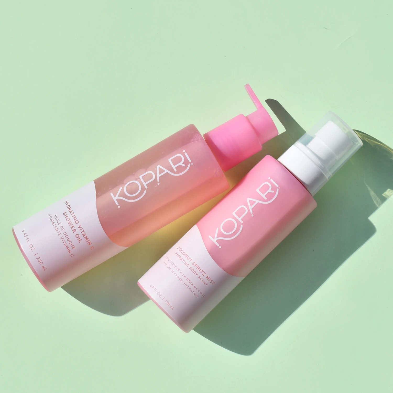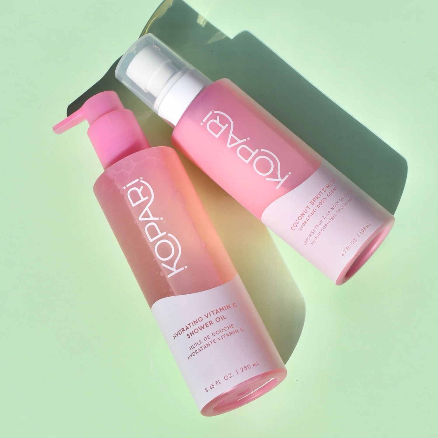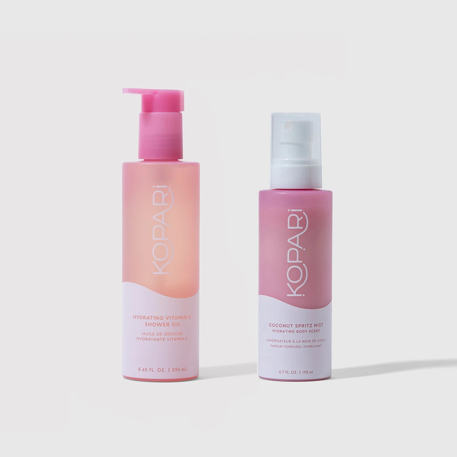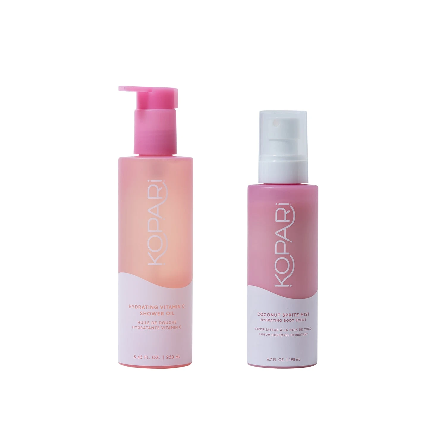 Smell like coconut bliss with this body duo, complete with our full size Vitamin C Sudsy Shower Oil with Hibiscus and Avocado Oils and Coconut Spritz Mist with Niacinamide, Hyaluronic Acid and Squalane