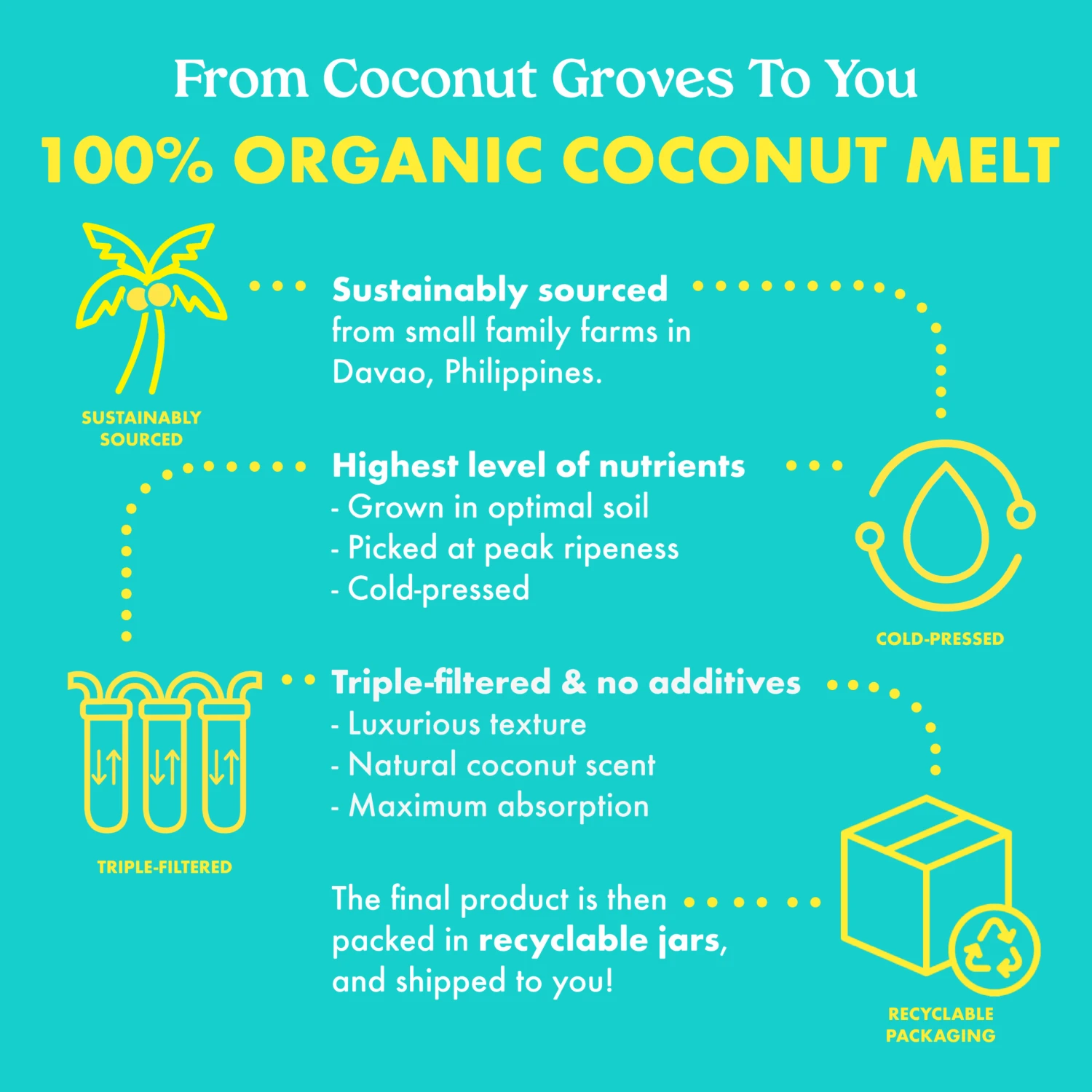Our best selling product is now a mini. Lighten up your on-the-go hydration game – we wouldn’t want you to be caught dehydrated. This is the holy grail of coconut oil. Our 100% organic and unrefined coconut oil works as a moisturizer, under-eye rescuer, makeup remover, and lip soother. This little Coconut Mini Melt MacGyver can do it all.Dermatologist-tested, Safe for sensitive skin