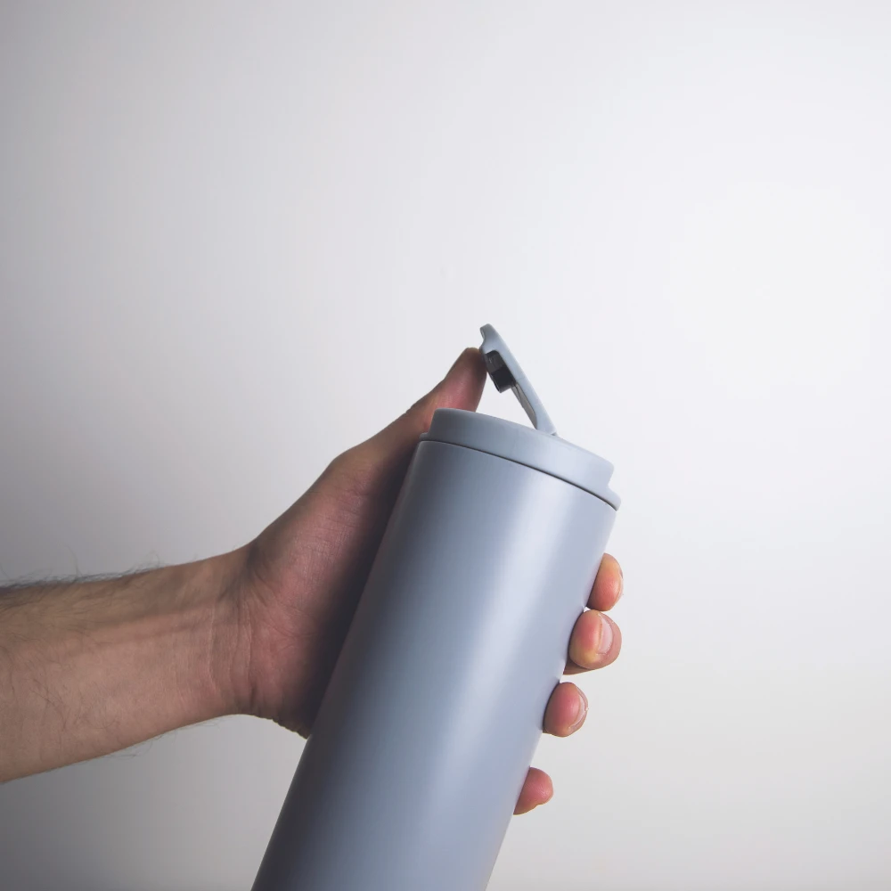 The thermal bottle made of stainless steel.