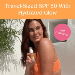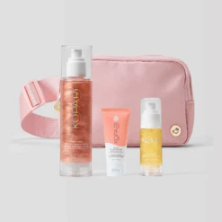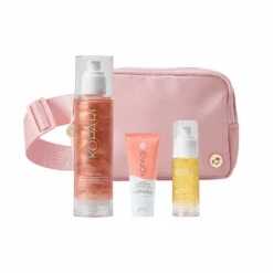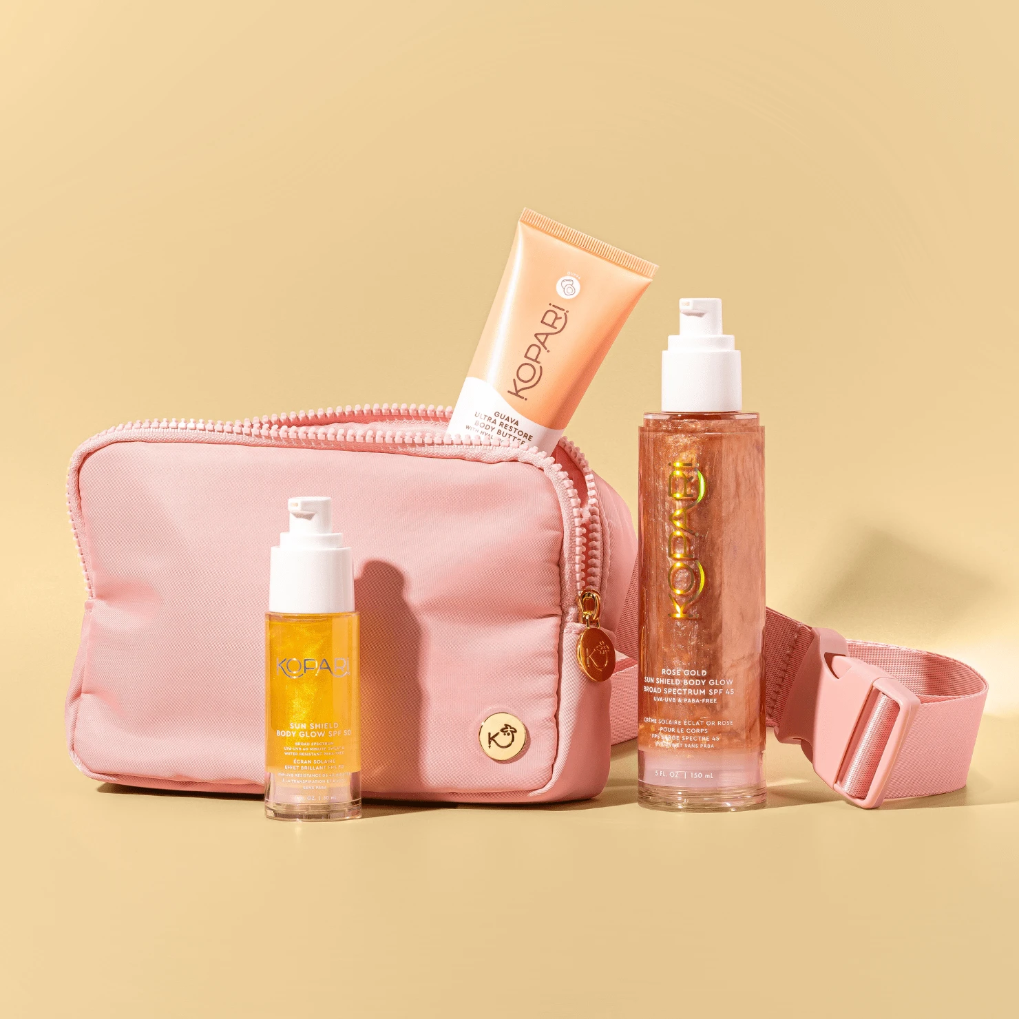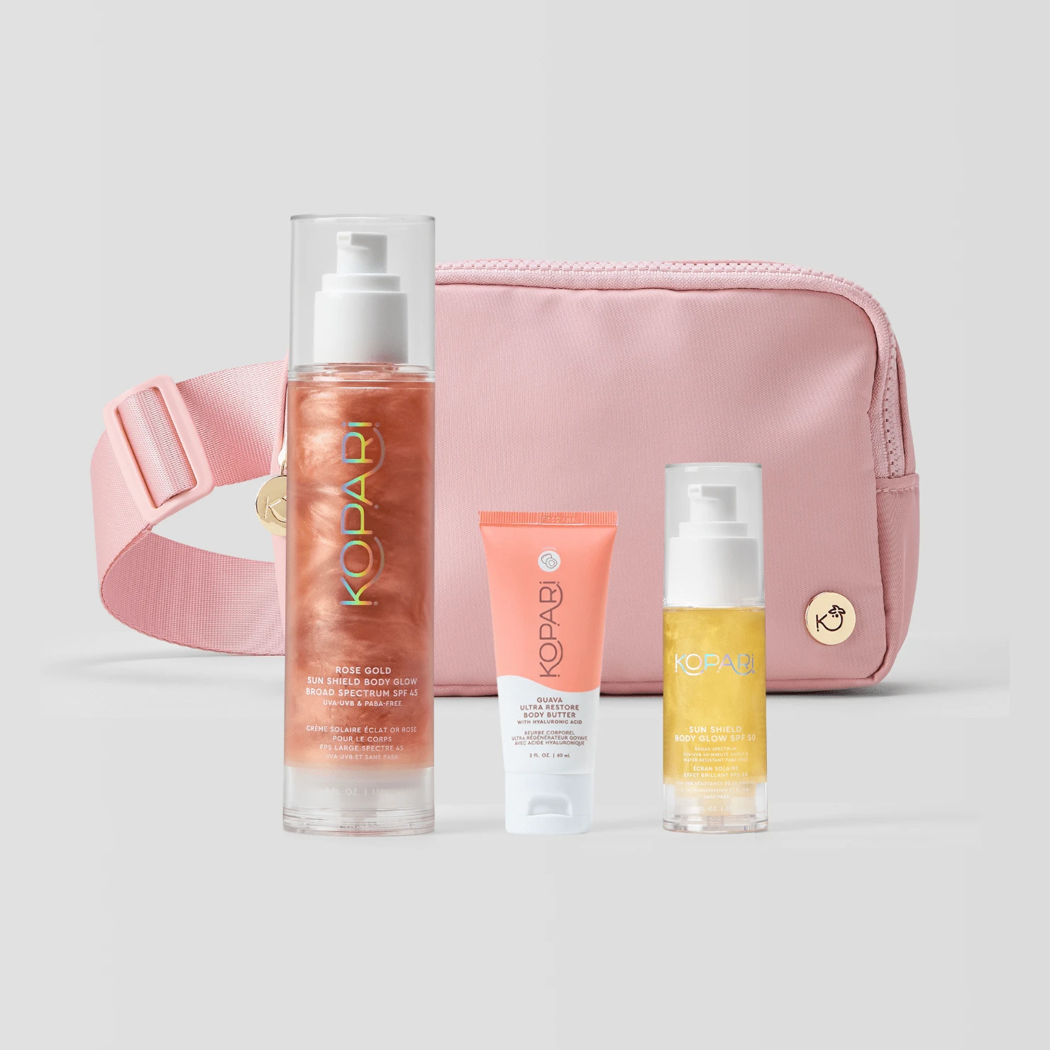 Stay protected & hydrated wherever you go with the Sun Day On-The-Go Body Set. Enjoy broad-spectrum UVA/UVB protection with our full-size Rose Gold Sun Shield SPF 45 and travel-sized Original Gold Sun Shield Body Glow SPF 50 — exclusive to this set! The mini Ultra Restore Body Butter in Guava scent keeps the paradise vibes going and your skin ultra-hydrated and glowy. Plus, get the limited-edition Kopari belt bag to tote all of your essentials.