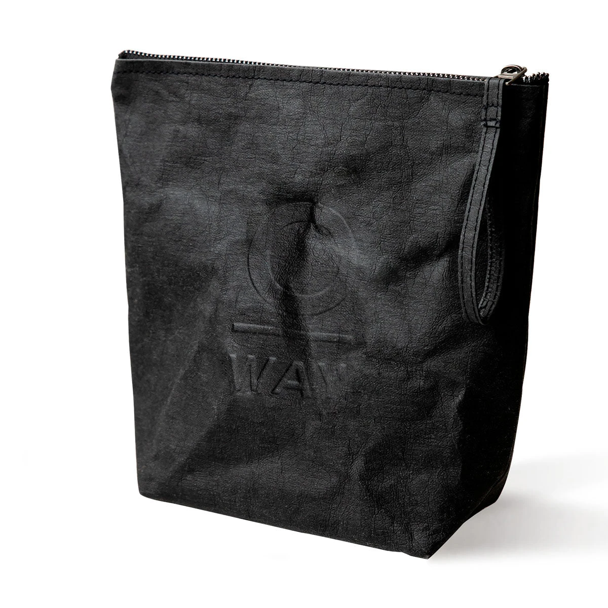 Washable paper clutch bag, equipped with a wrist strap for easy carrying and a metal zip closure.